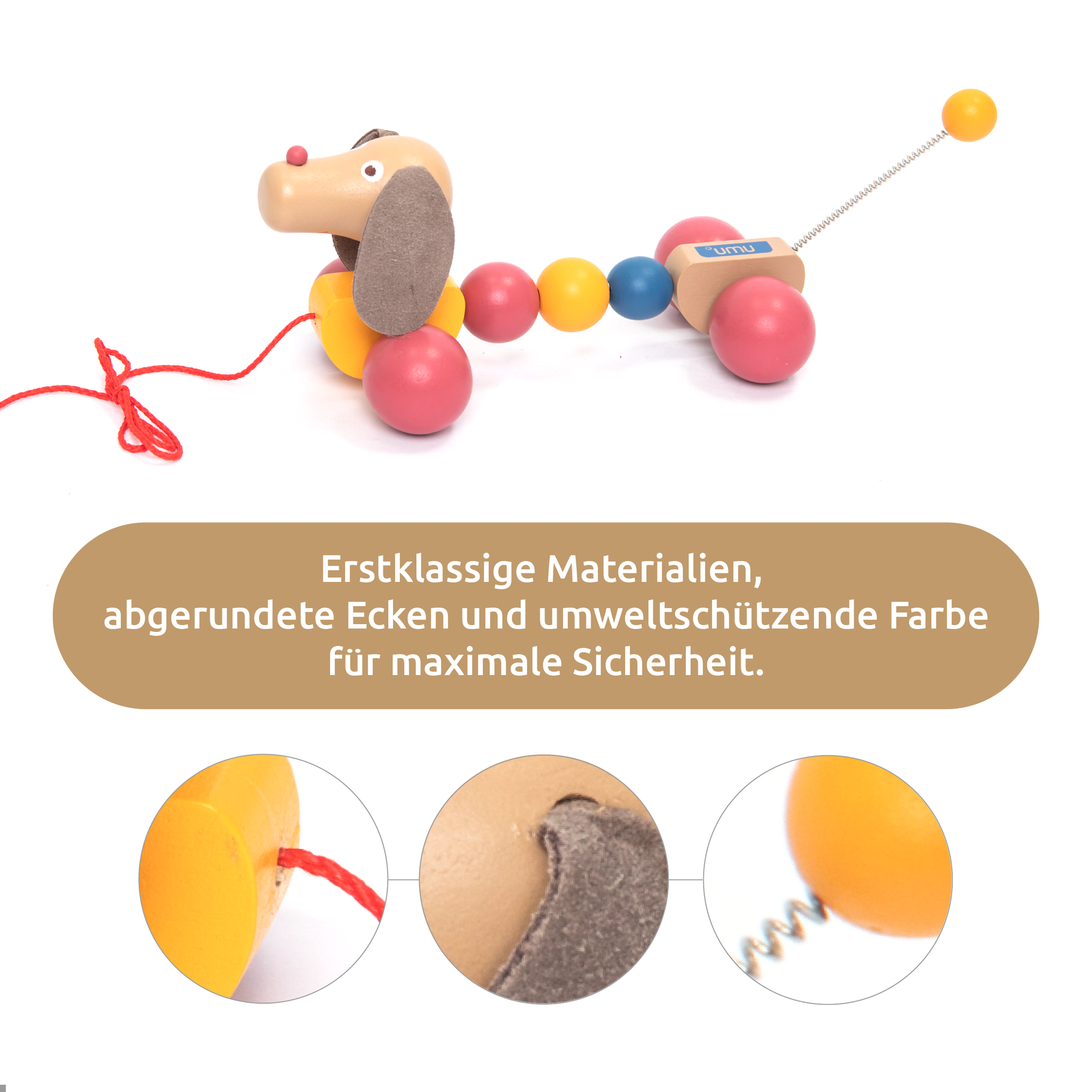 Der Hund wird an einer Schnur hinter dem Kind hergezogen; die Räder rollen sanft auf Böden und Teppichen.